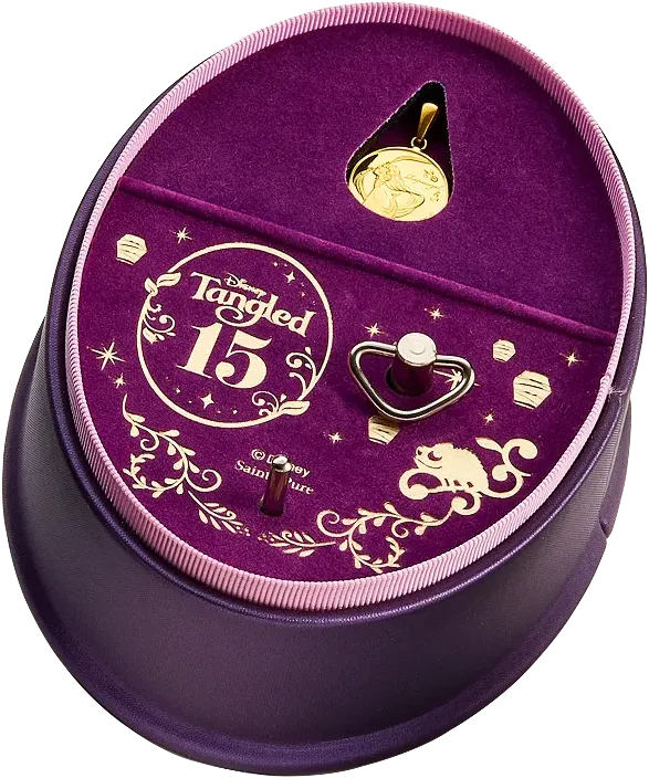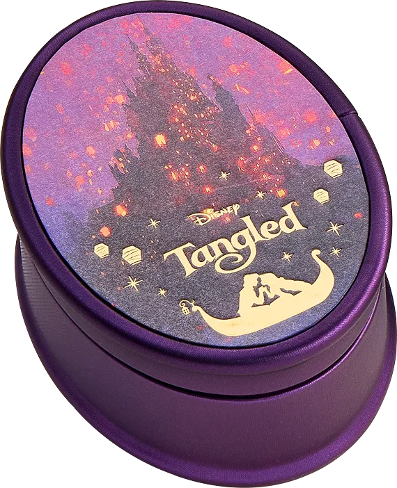 表面にはラプンツェルの華やかな姿があしらわれ、繊細な花のモチーフとともに美しく彩られています。髪やドレスの流れなど細部にまでこだわった造形に。