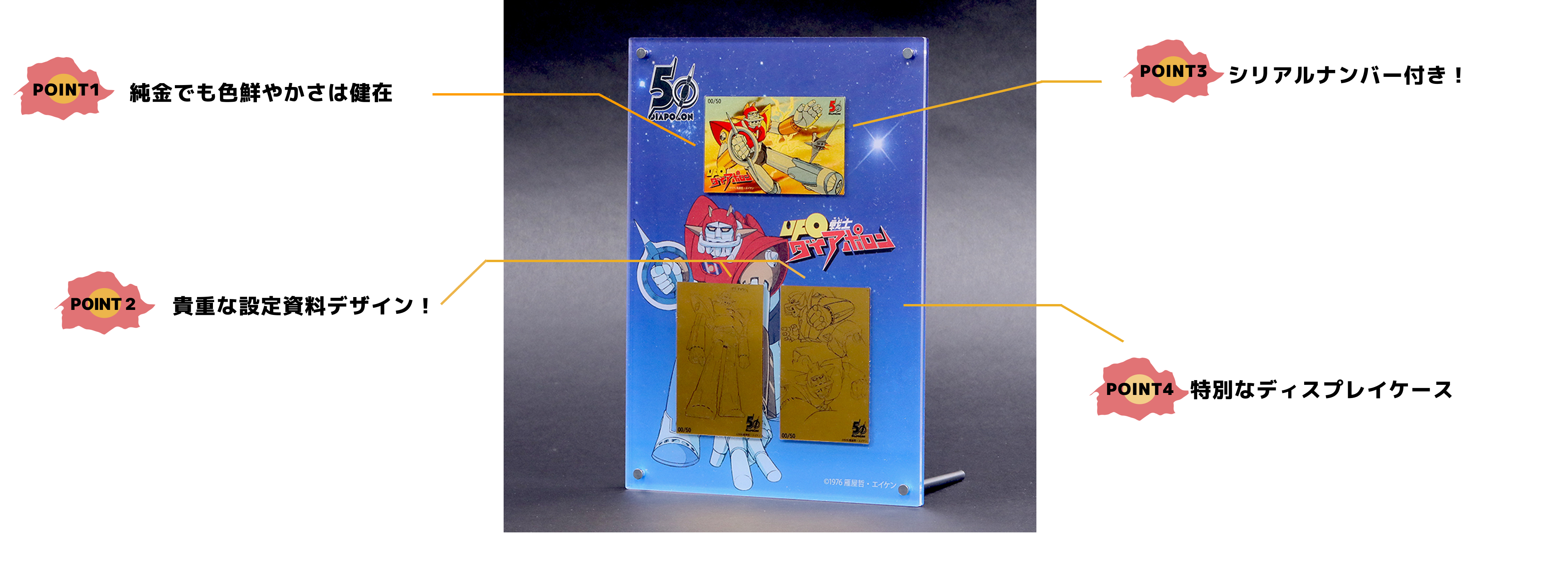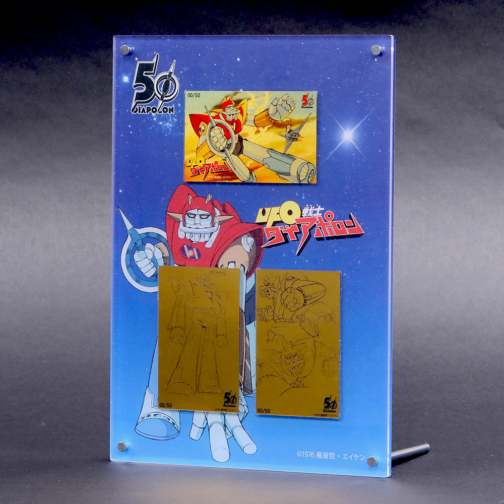 コンプリートセットオリジナルのディスプレイケース。 大きくデザインされたダイアポロンがインパクト抜群! 50周年のロゴが入ったメモリアル感のあるデザインで宇宙のグラデーションも純金の黄金色とマッチしている こだわり抜かれたディスプレイケースです。