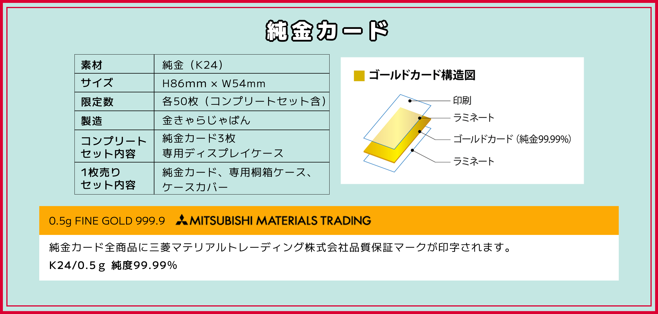 証明書お付けしておりませんが、純金カードの裏面に三菱マテリアルトレーディング株式会社の品質保証マークが印字されます。